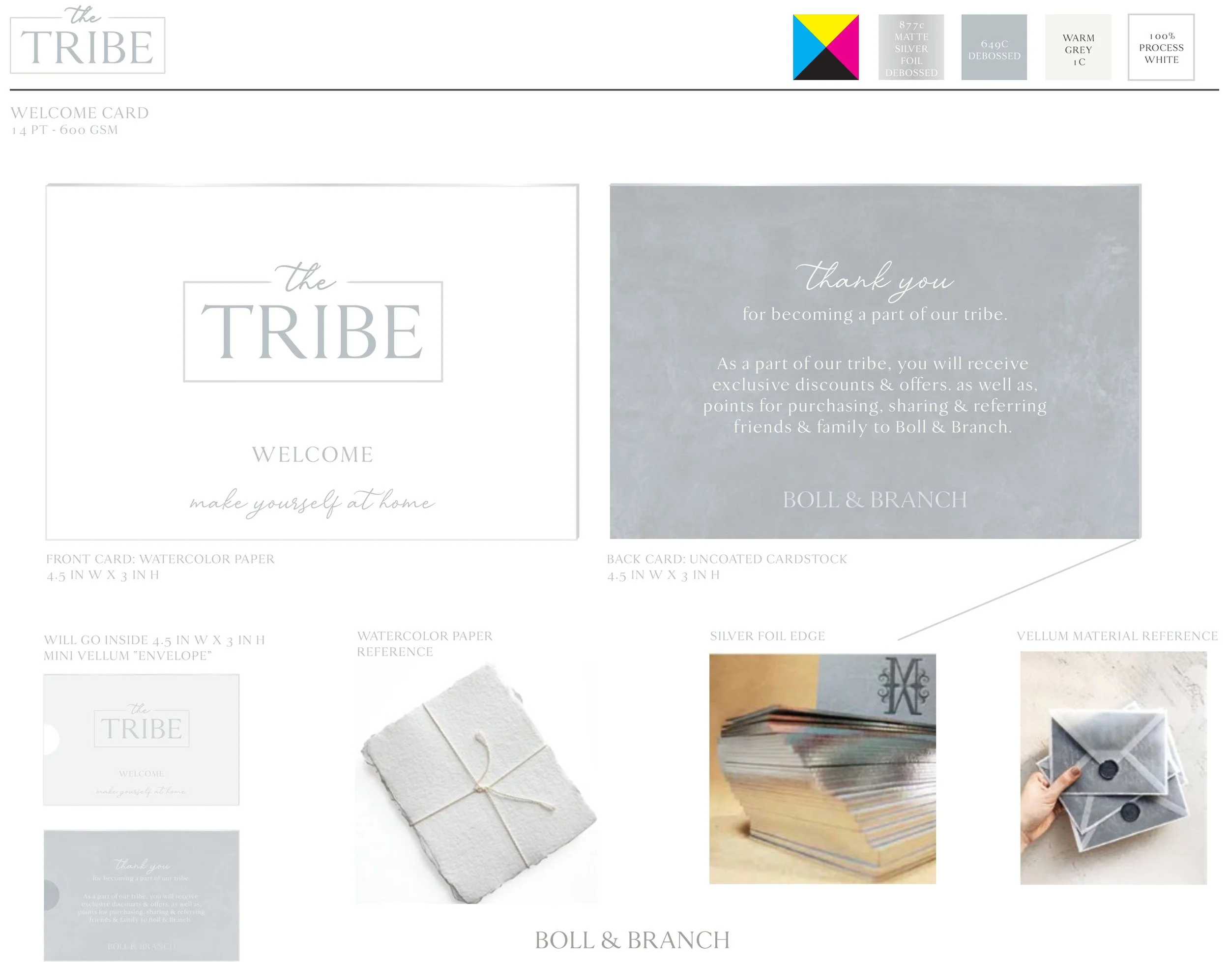 Boll & Branch wanted to create the look & feel for a new loyalty program that they were trying out, called The Tribe. This project was so fun from start to finish. I loved matching the soft, clean earthy vibe of Boll & Branch while adding luxe artistic touches to the packaging & print materials. For example, the lines of the square box are finished with points to symbolize arrows. And, I love the top ripped edge of the belly band for the packaging; this subtle touch is a nod at the raw or hand made feeling that The Tribe invokes.